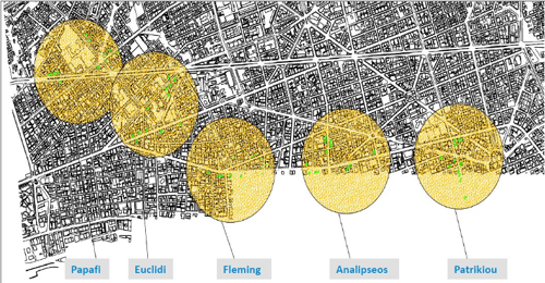 Мы упоминаем некоторые важные данные, полученные из исследований (Nikiforiadis, Roukouni, Basbas and Chrysostomou, 2020), которые изучали ожидания воздействия станций метро в районе центра и востока города. Они выбрали 10 станций, исключая станции, которые предназначены для обслуживания кампусов и жилых районов. Буферная зона для каждой станции составляла радиус 250 метров.